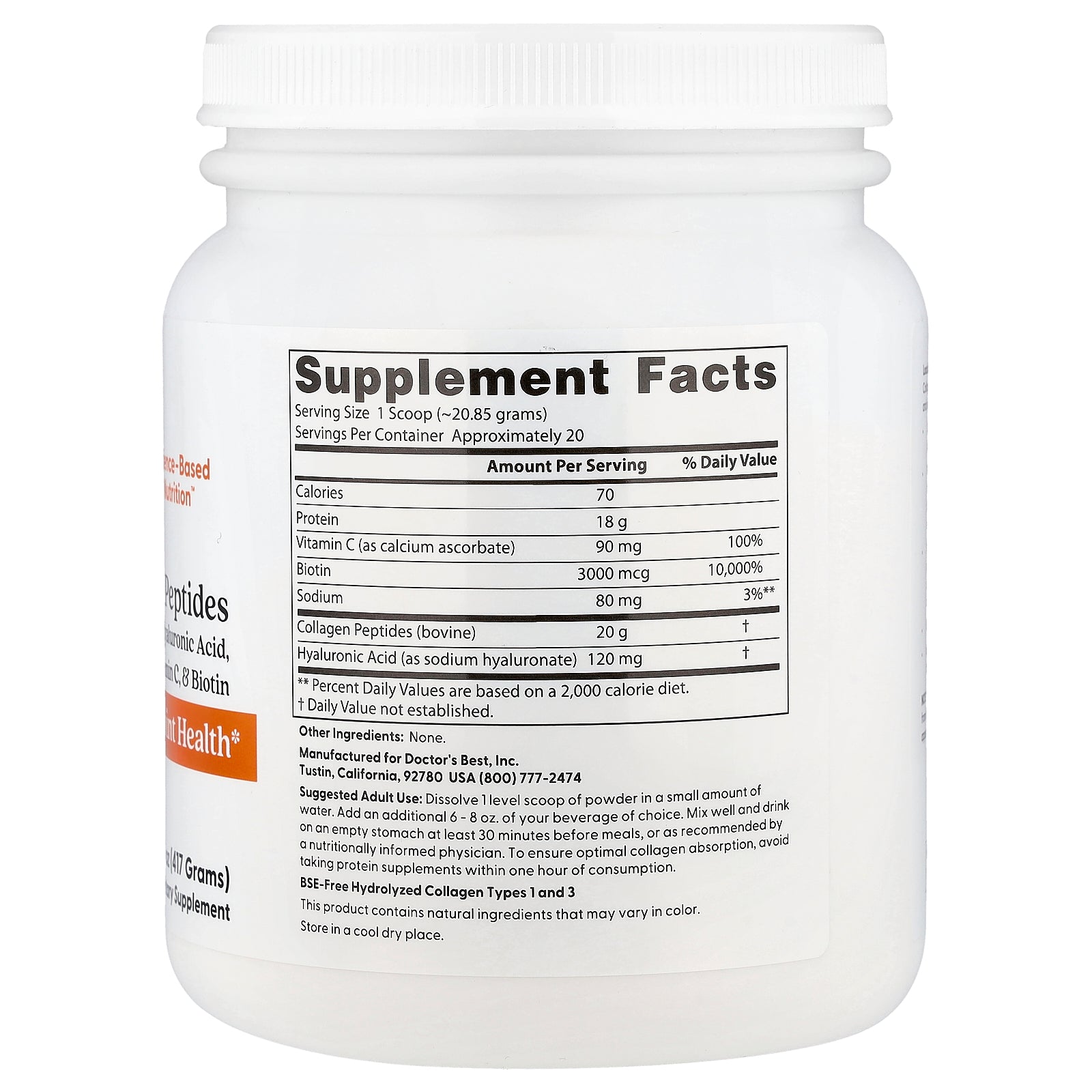 Doctor's Best Pure Collagen Peptides with Added Hyaluronic Acid, Vitamin C, & Biotin, Net Wt. 14.8 oz (417 Grams)