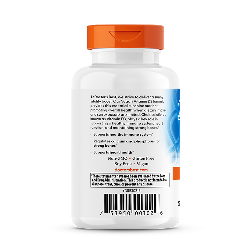 At Doctor's Best, we strive to deliver a sunny vitality boost. Our Vegan Vitamin D3 formula provides this essential sunshine nutrient, promoting overall health when dietary intake and sun exposure are limited. Cholecalciferol, known as Vitamin D3, plays a key role in supporting a healthy immune system, heart function, and maintaining strong bones.*